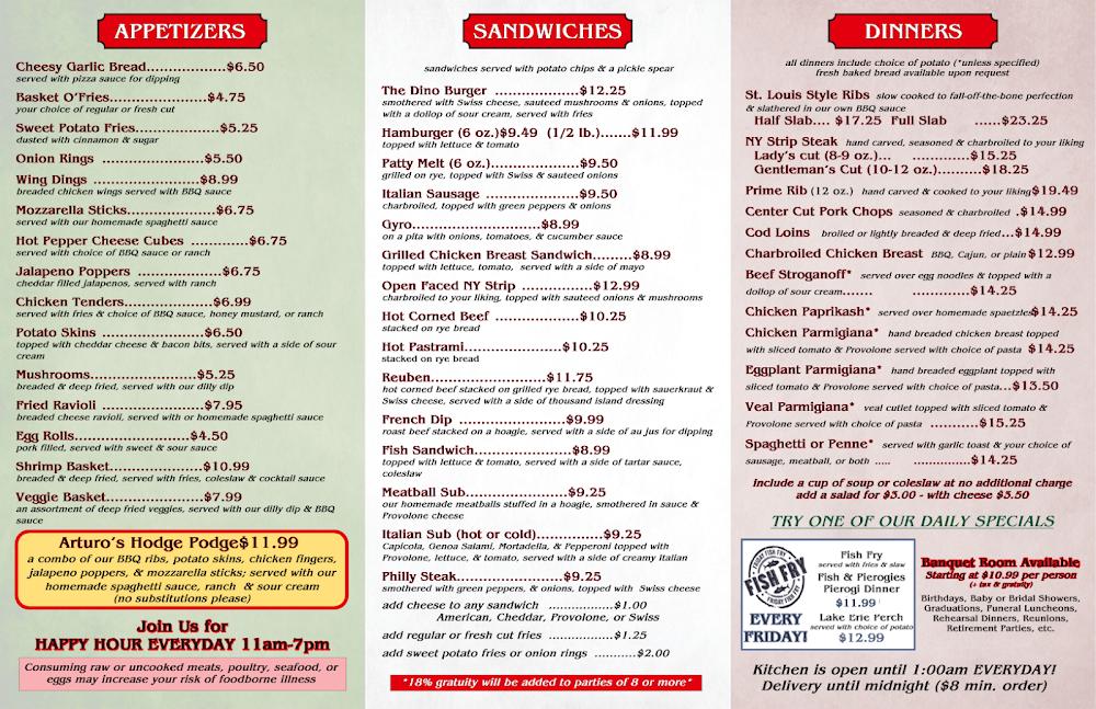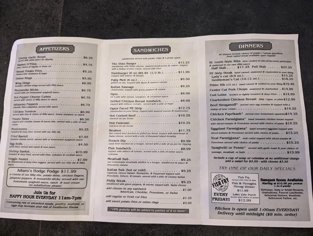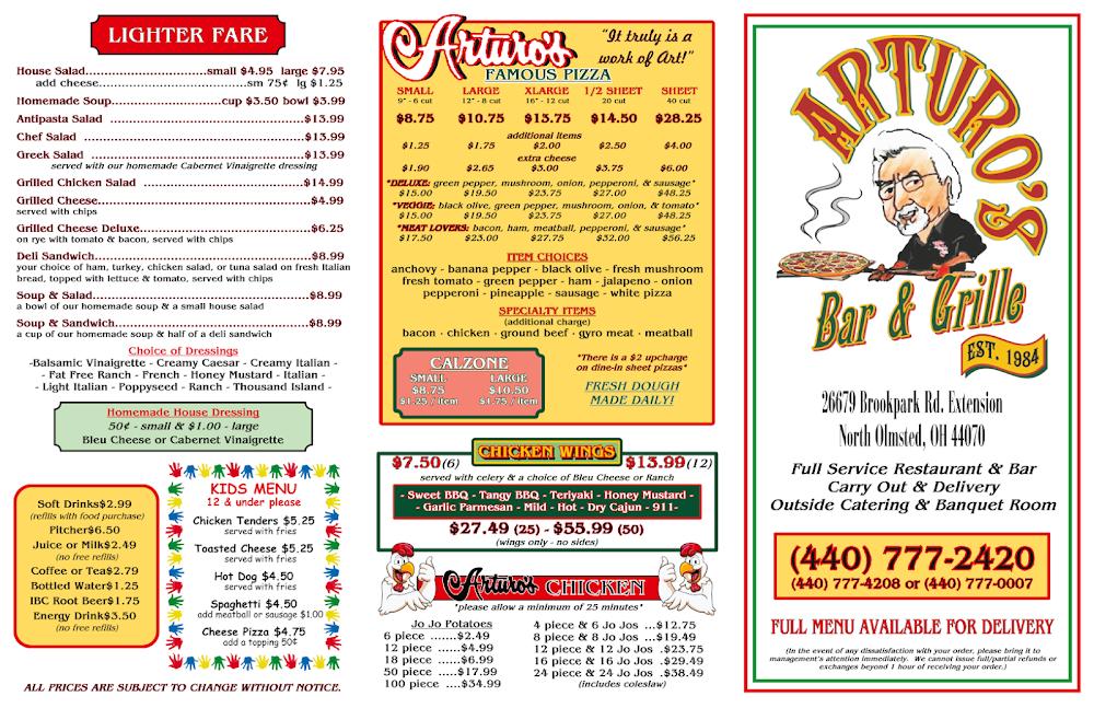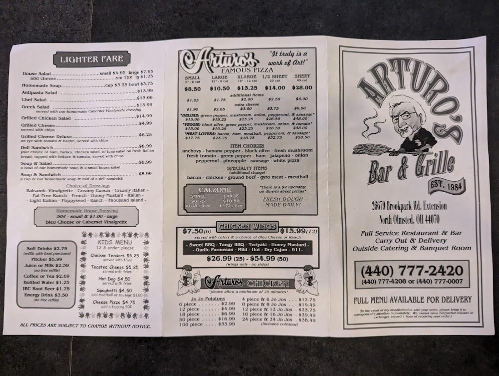 Welcome to Arturo's Bar & Grill, your go-to destination for mouthwatering grilled dishes and refreshing beverages in North Olmsted, OH. Located at 26679 Brookpark Ext, our vibrant eatery offers a diverse menu featuring local specialties, excellent cocktails, and a wide selection of beers. Whether you're dining in, ordering takeout, or enjoying our contactless delivery, you're guaranteed a satisfying experience. With accessible seating and amenities, Arturo's is perfect for solo lunches, casual dinners, or gathering with friends. Don't miss out on our happy hour specials and live sports—come join us for a memorable dining experience!